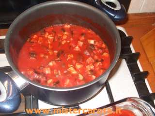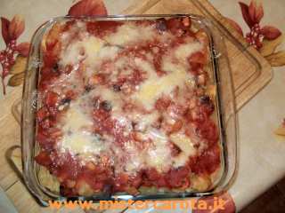 Ingredienti: 200 gr di pasta tipo lumache - 1 cipolla - olio extravergine d'oliva - sale - pepe - 2 cucchiai di ricotta forte (o ricotta 'scante, morbida spalmabile, fatta in Puglia e Basilicata) - 750 ml di salsa di pomodoro - 1 melanzana - 150 gr di formaggio rodez.