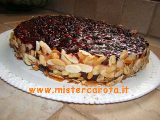 Liberare la torta dallo stampo e sistemarla nel piatto da portata, spalmare un leggero velo di marmellata di mirtilli su tutto il bordo e far aderire le scaglie di mandorle precedentemente tostate per qualche minuto in una padellina.