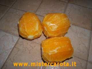 Lavare accuratamente le arance non trattate, togliere la parte arancione della buccia con il pelapatate stando attenti a non prelevare la parte bianca.