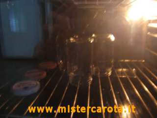 Nel frattempo sterilizzare i vasetti e i rispettivi coperchi lavandoli bene con acqua caldissima, metterli capovolti dentro il forno acceso a 100°C. per circa 10 minuti.