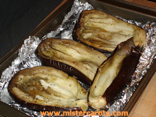 Prendo le melanzane, le taglio in due le cospargo di sale grosso e origano, le avvolgo in cartas stagnola e le faccio cuocere in forno per 15-20 minuti a 180°C oppure fino a quando la polpa sarà morbida.