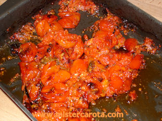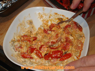 Prendo dei pomodorini, li taglio in quattro, li condisco con prezzemolo origano olio sale e pepe e li faccio cuocere in forno per 20 minuti.