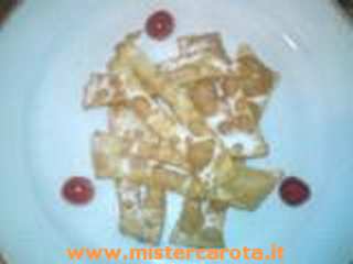 Stendere con un matterello la pasta che dovrà avere lo spessore massimo di circa 3-4 mm, e ritagliare delle strisce lunghe non più di 10 cm e larghe 2 cm.