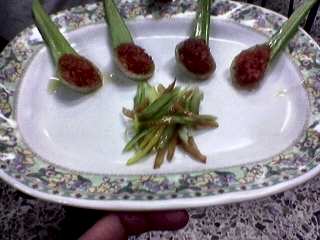 Dopo aver amalgamato per bene con una forchetta la marinata, formare i mestolini riempiendo con il salmone la cavità del sedano (vedi foto), disporre sui piatti a ventaglio e al centro disporre a monticello le verdurine croccanti.