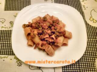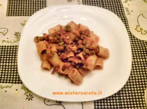 Ingredienti: 350 gr di pasta mezze maniche - 250 gr di piselli anche surgelati - 150 gr di pancetta tagliata a dadini - 1/2 cipolla - 1/2 bicchiere di vino bianco secco - 300 gr di passata di pomodoro - olio - sale q.b.