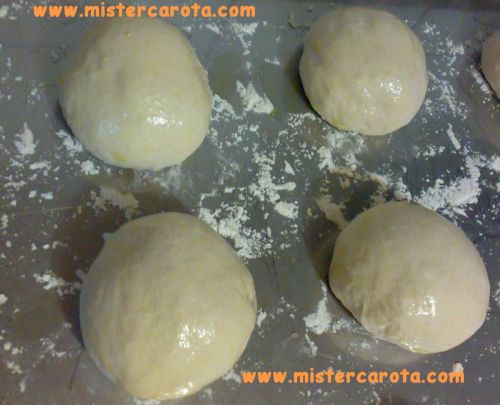 Trascorso il tempo di puntatura dell'impasto, pesatelo e suddividetelo in 9 pezzi, quindi, fate delle palline come in foto spennellatele con olio d'oliva e copritele con un telo di plastica.