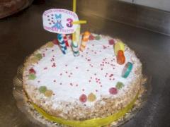 Adesso con una spatolina spalmare un po' di panna intorno alla torta, sbriciolare i ritagli di pasta e appiccicarli intorno alla torta, sopra spolverizzare uno strato abbondante di zucchero a velo.
