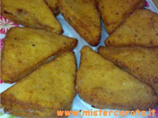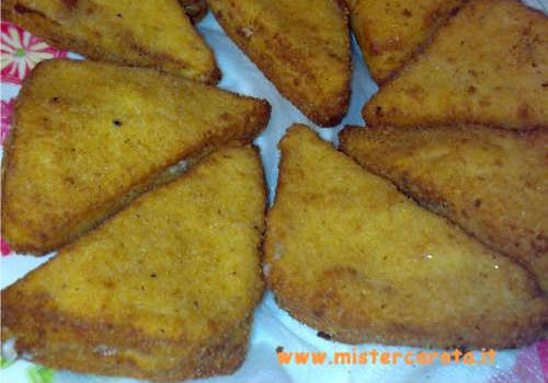 Completati tutti i pezzi, bagnate le fette nel composto d'uova e latte e fate sì che si assorbono un po' di esso, trasferitele man mano nel pangrattato e pigiatele delicatamente facendo aderire bene il pangrattato, fate attenzione a non far fuoriuscire il contenuto.