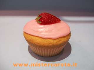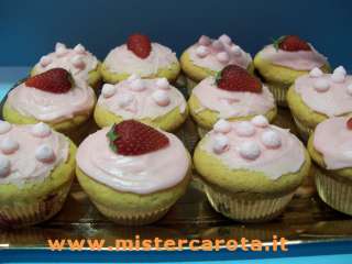 Distribuire la glassa sui muffin e decorare con 1/2 fragola.