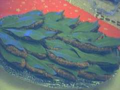 Tritare le noci (non ridurre in polvere ma tritare); staccare le foglie di alloro, lavarle ed asciugarle; in una casseruola portare ad ebollizione il miele; aggiungere le noci, abbassare la fiamma e con una paletta mescolare in continuazione fino a che il miele comincia colorarsi e ad addensarsi e tutto il composto inizia a attaccarsi alla paletta; togliere dal fuoco e continuare mescolare qualche minuto, poi versare immediatamente sulla spianatoia bagnata con acqua fredda, schiacciare il composto fino ad uno spessore di un centimetro, tagliarlo formando tanti rombi della grandezza di una foglia di alloro, ed ogni 'rombo' racchiuderlo in due foglie di alloro e schiacciarlo un po' per far aderire le foglie; questa operazione va fatta in fretta prima che tutto il composto si raffreddi e si stacchi difficilmente dalla spianatoia; servire con un liquore alla frutta. (questa è una ricetta di mia madre)