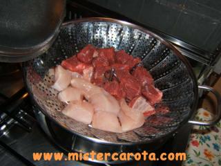 Ho cotto a vapore il manzo ed il petto di pollo, tagliandolo a pezzetti piccoli per facilitarne la cottura (la cottura a vapore mantiene intatte le proprietà e i principi nutritivi delle carni, altrimenti si può lessare la carne direttamente nel brodo), utilizzando per la cottura a vapore parte di questo brodo vegetale.