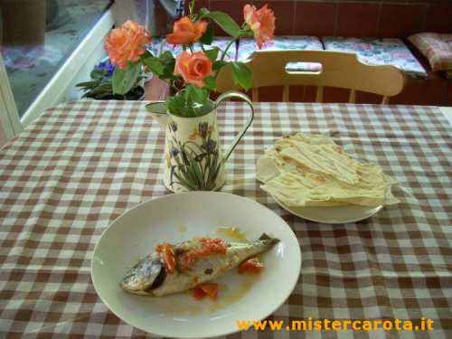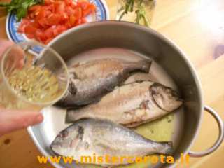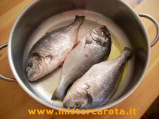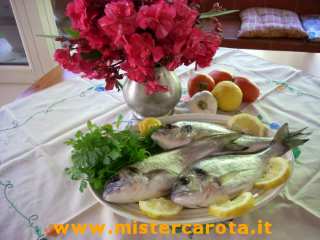 Ingredienti: 1,300 Kg di orate - alcuni pomodorini - un ciuffetto di prezzemolo - 2 spicchi di aglio - 1/2 bicchiere di vino bianco - 1/2 bicchiere di acqua bollente - olio extravergine d'oliva, sale q.b.