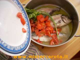 Adesso metterci i pomodori il prezzemolo ed il sale. Mettere sul fuoco e cuocere a fiamma bassa per 25 minuti crca. Girare il pesce a metà cottura.