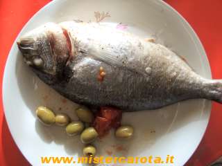 Ingredienti: 4 orate - 2 pomodori ramati - 50 gr di olive verdi - sale - pepe.