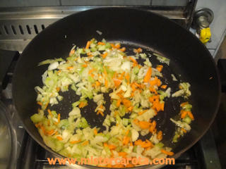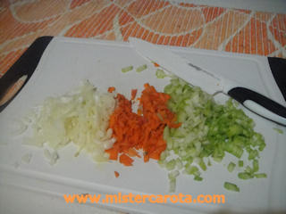 Lavare e tritare il sedano e la carota, pelare e tritare le cipolle e l'aglio, far soffriggere in un po' d'olio extra a fuoco basso in una casseruola abbastanza larga.
