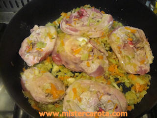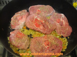 Aggiungere gli ossobuchi, spolverarli con origano, rosmarino, pepe e sale, farli rosolare e insaporire con le verdure da ambo le parti, coprire e lasciarli cuocere per 15-20 minuti.