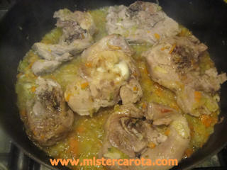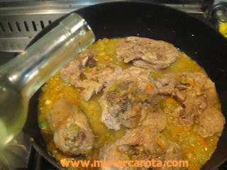 Dopo 15-20 minuti, aggiungere vino bianco, vino Marsala e un mestolino di acqua o brodo (senza sale).