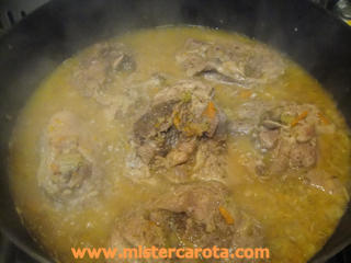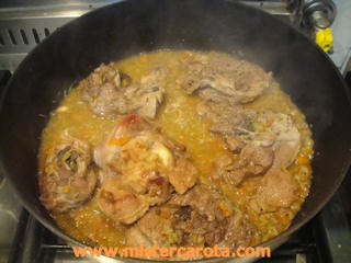 Coprire e far cuocere per almeno 40 minuti a fuoco basso, aggiungendo se occorre acqua o brodo (senza sale) e, a fine cottura, facendo addensare un po' la salsa.
