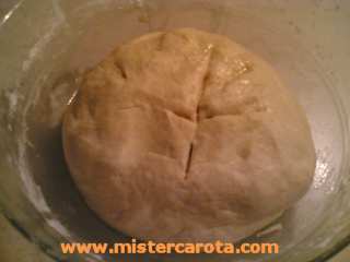 Portate l'impasto sul piano di lavoro e lavoratelo per almeno 15-20 minuti, sbattendolo bene sul ripiano stesso per far formare il glutine dalla farina: dovr? risultare un impasto liscio e sodo, se fosse troppo morbido, aggiungete al piano di lavoro poca farina alla volta e continuate ad impastare.