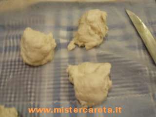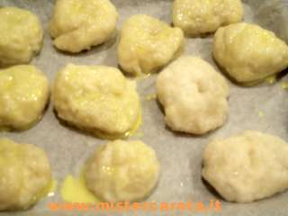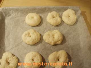 datele una forma sferica (grossolana, cercate di non tenerla troppo in mano) poi schiacciatela un po' e adagiatela su una teglia coperta di carta da forno (quelle nella foto hanno il buco al centro perché a mia figlia piacevano così).