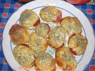 Ingredienti per i panini: pasta per pane - semi di papavero - 1 tuorlo d'uovo Ingredienti per l'imbottitura: salamino tipo cacciatore - groviera