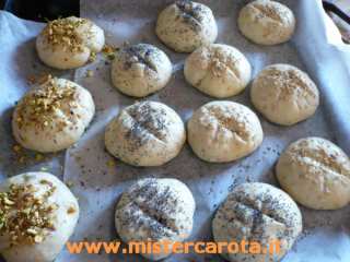 Dividete l'impasto in 3 ed aggiungete ad uno una manciata di semi di papavero, ad uno di semi di sesamo e ad uno i pistacchi sbucciati e tritati grossolanamente.