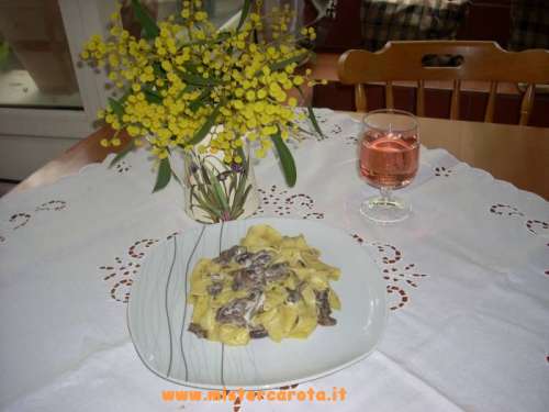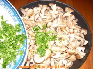 Ingredienti per 4 persone: 350 gr di pappardelle all'uovo fresche - 500 gr di funghi champignon - alcuni rametti di prezzemolo - 2 spicchi di aglio - 1 pezzettino di cipolla - olio extravergine d'oliva - sale q.b. - 1 scatolina di panna da cucina