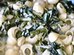 Ingredienti per 4 persone: 400 gr di catalogna o cicoria - 4 acciughe sott'olio - 2 spicchi d'aglio - 240 gr di pasta tipo conchiglie - formaggio filante - sale - pepe - olio extravergine d'oliva.