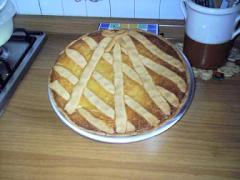Prendere la teglia foderata di pasta frolla e riempirla con il composto fino al bordi, con altra pasta frolla formare delle strisce tipo crostata.