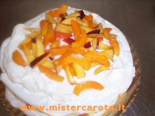 Nel frattempo montare la panna con un cucchiaio di zucchero, prendere i dischi di meringa, staccarli delicatamente dalla carta, posizionare il primo su un piatto da portata, mettendo sul fondo un cucchiaino di panna per evitare che la meringa si muova, fare uno strato di panna, messa cosi come viene, con un cucchiaio, mettere sopra la frutta a pezzettini, appoggiare sopra il secondo disco di meringa, premendo delicatamente (si rompe molto facilmente), mettere sopra la panna rimasta, sempre giocando col cucchiaio per spalmarla in modo disordinato, mettere sopra la frutta a spicchi... e buon appetito!