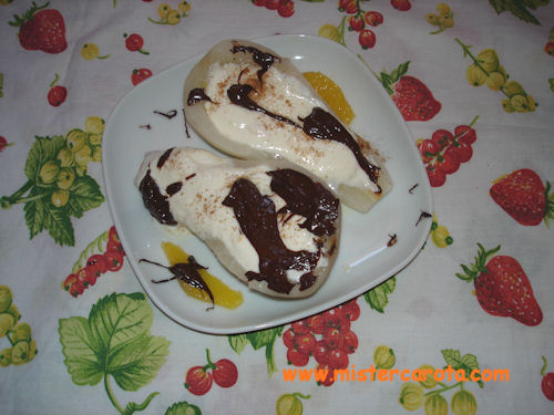 Ingredienti: 2 pere tipo abate - 1 arancia - 300 gr di ricotta fresca - 150 gr di zucchero - 100 gr di cioccolato fondente - 10 gr di cannella.