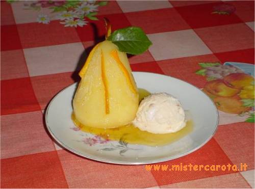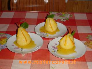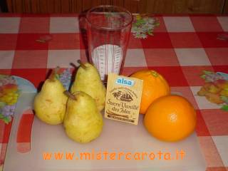 Prendere il sugo dei arance e metterlo in una pentola abastanza grande per contenere le pere. Aggiungere 100 gr di zucchero e la bustina di zucchero vanigliato, fare bollire e mettere le pere.
