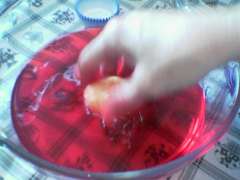 Intanto preparare in una ciotola circa 1/2 lt di Vermouth con una fiala di colorante rosso, in piatto mettere lo zucchero,riempire metà guscio con la crema pasticcera