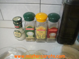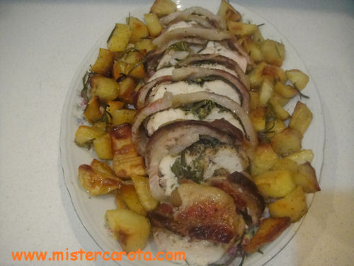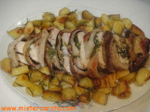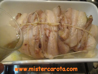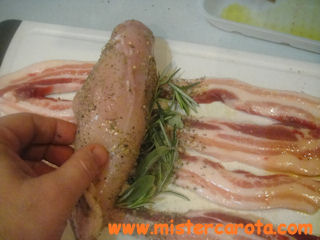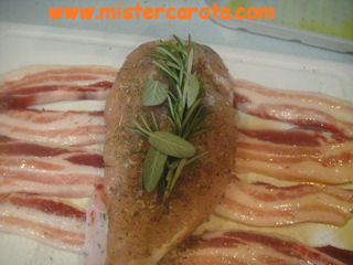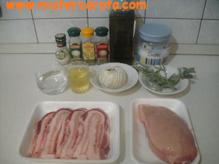 Ingredienti: 1 petto di pollo di circa 500 gr - 380 gr di pancetta tesa - 1/2 bicchiere di vino bianco - un goccio d'acqua - aglio in polvere - origano - timo - pepe - rosmarino fresco - salvia fresca - sale - olio extravergine d'oliva