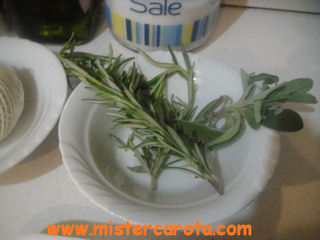 Disporvi sopra il petto di pollo, sotto e sopra il petto mettere un rametto di rosmarino ed uno di salvia.