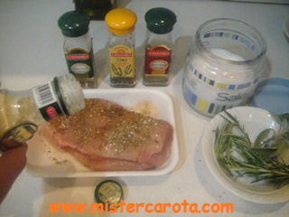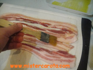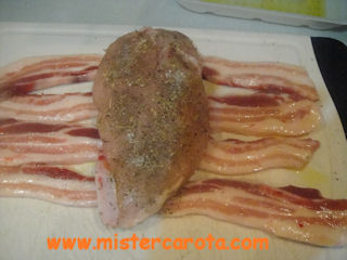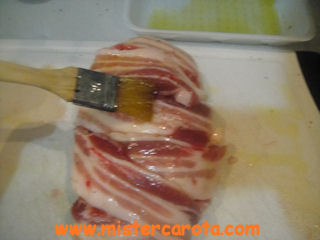 Condire la carne con timo, origano, aglio in polvere, pepe e sale. Disporre le fette di pancetta l'una accanto l'altra e spennellarle di olio extra