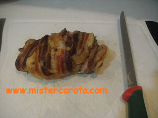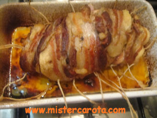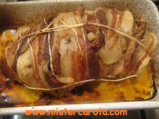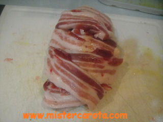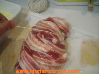 Tagliare lo spago superiormente in modo da sfilarlo in modo facile senza "rovinare" la copertura di pancetta
