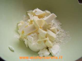 Ingredienti: 100 gr di ricotta sgocciolata - 100 gr di burro freddo a pezzettini - 100 gr di farina 00 - un pizzico di sale.