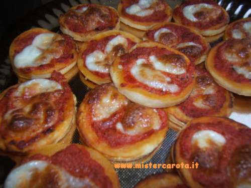 Stendere la sfoglia ad uno spessore di circa 6-7 mm, ma non più bassa, ricavare dei dischi con il coppapasta, condire a piacere e infornare a 180°C. per circa 20 minuti.
