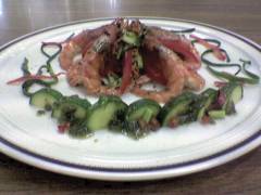 Scottare i gamberi nella stessa acqua di cottura del polpo per circa 10 minuti e ancora caldi marinarli subito con l'identica marinatura e stesso procedimento del polpo, e mettere da parte.