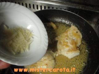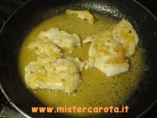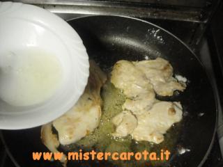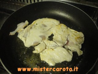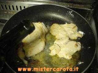 Cuocere le fettine di petto di pollo in burro ed olio extra.