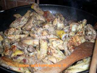 Pulire, lavare e cercare di spellare bene i polli, lavare e asciugare le erbe e tritarle finissime. Mettere i polli a marinare con le erbe per qualche ora. Soffriggere l'aglio con l'olio, aggiungere i polli tagliati a pezzi non troppo grandi con la marinata, far cuocere per pochi minuti a fuoco vivace, poi abbassare la fiamma e cuocere semi-coperto per un'ora circa, rigirandolo ogni tanto. Quando il pollo è quasi cotto, aggiungere il vino, alzare un pochino la fiamma e lasciare evaporare mentre il pollo finisce la sua rosolatura. ...è veramente una semplice... squisitezza!