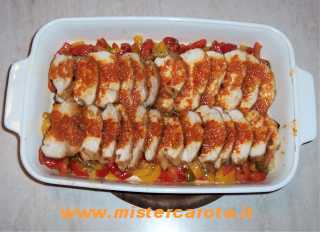 Riscaldate i peperoni e la salsa, mettete sul fondo di una pirofila da portata i peperoni a listerelle, sistematevi sopra le fette di pollo parzialmente sovrapposte, distribuite su ogni fetta un cucchiaio di salsa ai peperoni, coprite con stagnola, scaldate per circa 10 minuti in forno a 180°C. quindi servite.