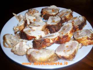 Schiacciare bene la polpa del pollo, farcire distribuendo il ripieno sulla polpa, arrotolare facendo in modo che il ripieno non fuoriesca.