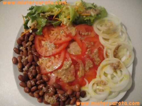 Ingredienti: 1 pomodoro rosso e sodo - una cipolla di media grandezza - 4 o 5 filetti di alici - 2 spicchi d'aglio - 80 gr di tonno sott'olio sgocciolato - qualche cucchiaiata di fagioli borlotti lessati - insalata mista - olio extravergine d'oliva - sale