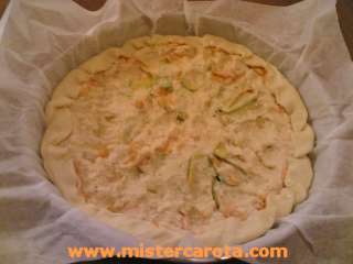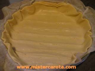 Stendete la pasta sfoglia su una tortiera foderata di carta forno (la tortiera deve avere un diametro di 26- 28 cm. e deve essere il più sottile possibile per una cottura omogenea) lasciando un bordo di circa 3 cm. attorno, bucherellatela con una forchetta, salatela leggermente e rimettetela in frigorifero.