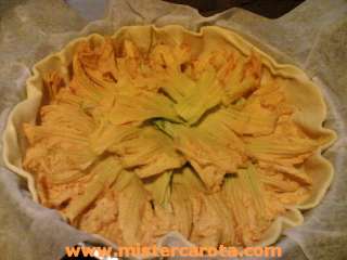 Fate uno strato di fiori nella pasta sfoglia, dovranno sormontarsi e non lasciare spazi vuoti, un pizzico di sale,