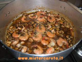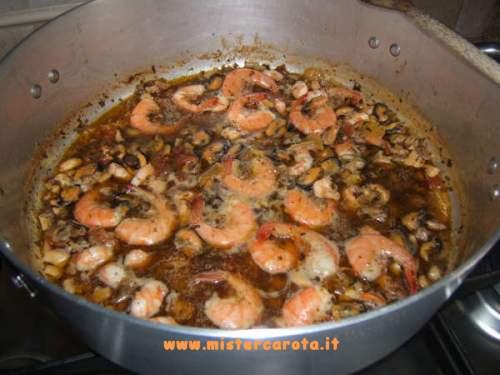 Aggiungere le cozze e le vongole e continuare la cottura per altri 5-8 minuti, aggiungere ora le code di mazzancolle, alcune sgusciate alcune no.