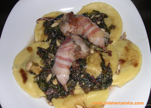 Preparare i ravioli tirando la pasta con la nonna papera (l'apposita macchinettta) fino al n°4 mettere il ripieno (lasciando in sospeso le cosce) inumidire la pasta con un pennello intinto nell'acqua, per aderire perfettamente i bordi.
