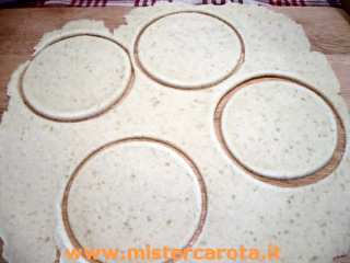 Stendetelo con il mattarello e con il fondo di un bicchiere o con un grosso stampino ricavatene dei dischi abbastanza grossi (la versione mignon che vedete in foto è quella di mia figlia)